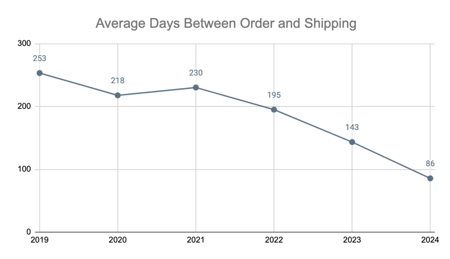Over the past five years, JOOR transaction data shows a 66% decrease in the number of days between order placement and shipment - from 253 days (2019) to just 86 days (2024).